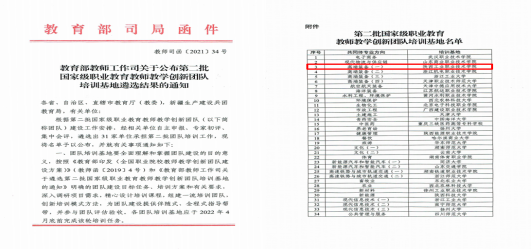 近日,教育部教师工作司印发《教育部教师工作司关于公布第二批创新团队培训基地遴选结果的通知》(教师司函〔2021〕34号),公布了第二批国家级职业教育教师教学创新团队培训基地名单。我校被确定为“高端装备”教育教师教学创新团队培训基地。本次成功获批,标志着我校职教师资培养培训工作又迈上新台阶。
