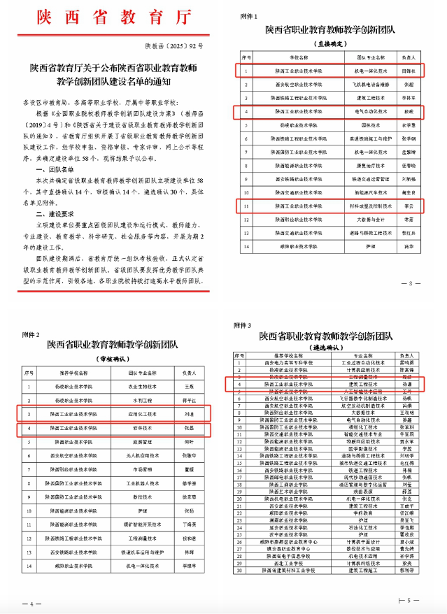 近日,省教育厅公布陕西省职业教育教师教学创新团队建设名单,我校6支团队成功入选,数量位居全省高职院校首位,彰显了学校在师资队伍建设领域的实力,为学校教育教学高质量发展注入强劲动力。