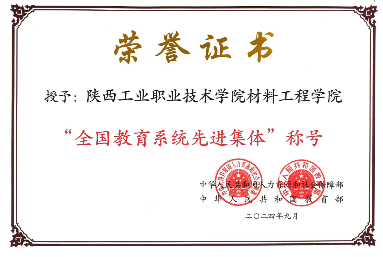 材料工程学院主持建成国家职业教育材料成型及控制技术专业教学资源库,获全国党建工作样板支部、国家教学成果一等奖、国家骨干专业、国家在线精品课程、国家职业教育教师教学创新团队、国家材料工程技术协同创新中心、国家自然科学基金、互联网+创新创业大赛国赛金奖、国家高技能人才培训基地等国家级荣誉64项,陕西省高校工程研究中心、陕西省青年创新团队等省级荣誉105项,人才培养模式与成效被《光明日报》等国家媒体专题报道。